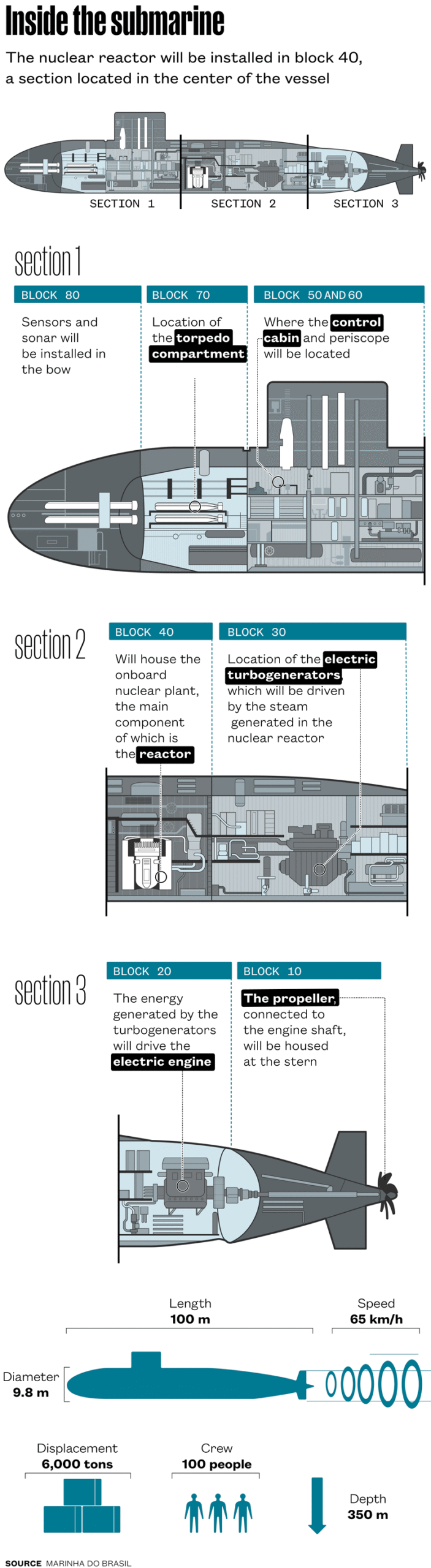 “Hoy en día, solo seis naciones son capaces de fabricar submarinos nucleares: Estados Unidos, Rusia, China, el Reino Unido, Francia e India”, afirma el contralmirante Sérgio Luís de Carvalho Miranda, director de desarrollo nuclear de la Marina. «Brasil es el primer país sin armas nucleares en construir este tipo de submarino».